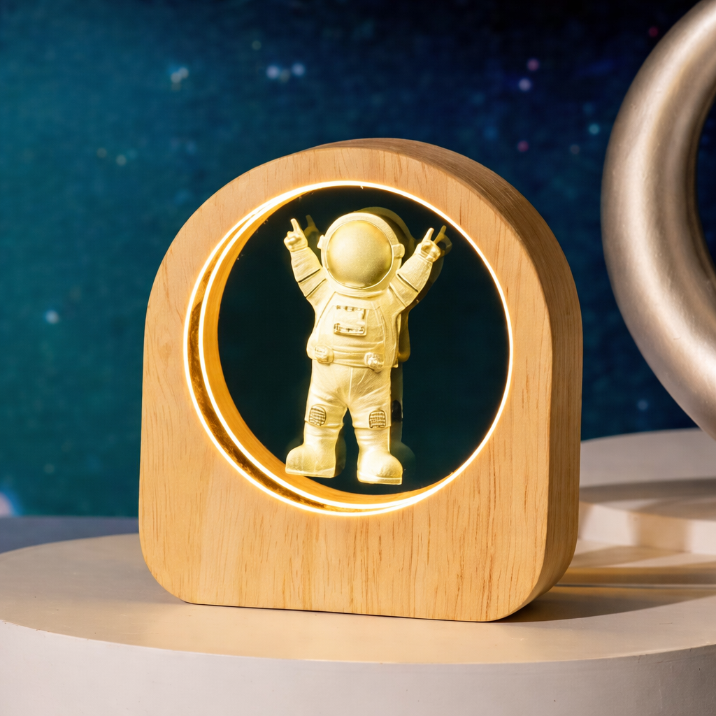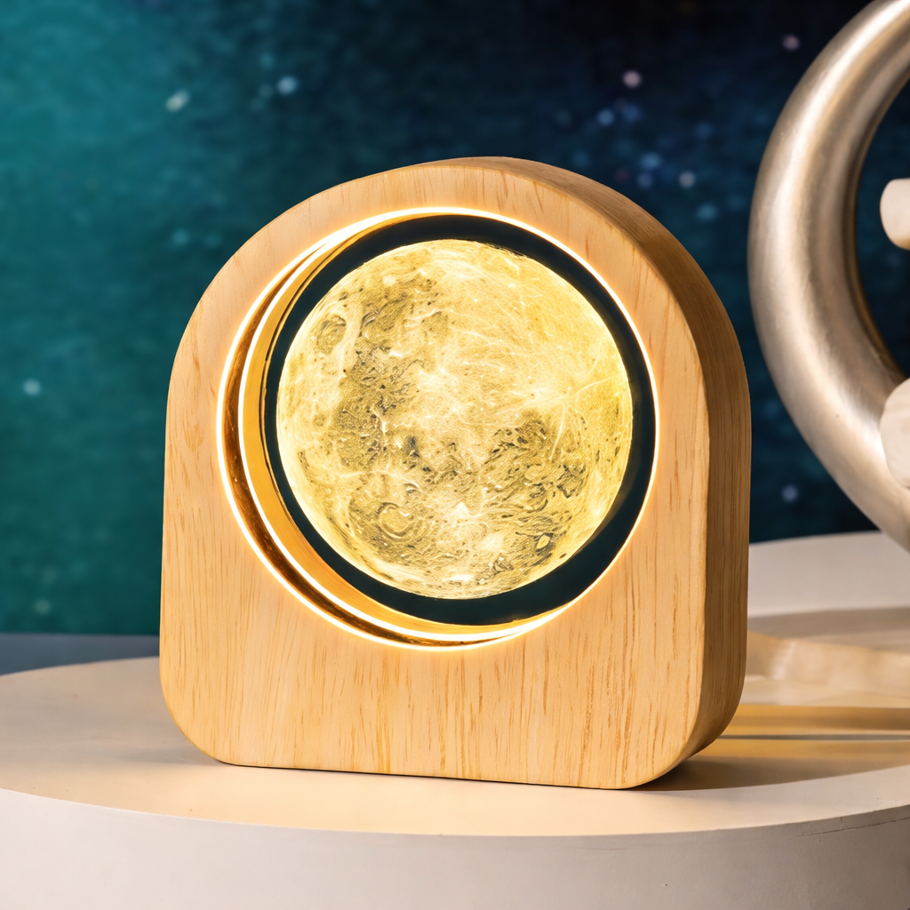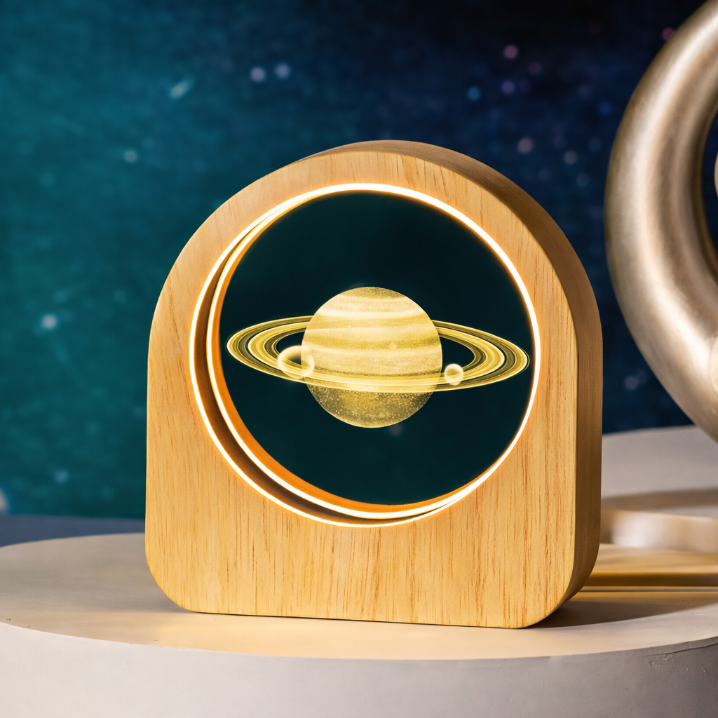 La luz suave y el diseño inspirado en el universo generan una sensación de orden y bienestar.